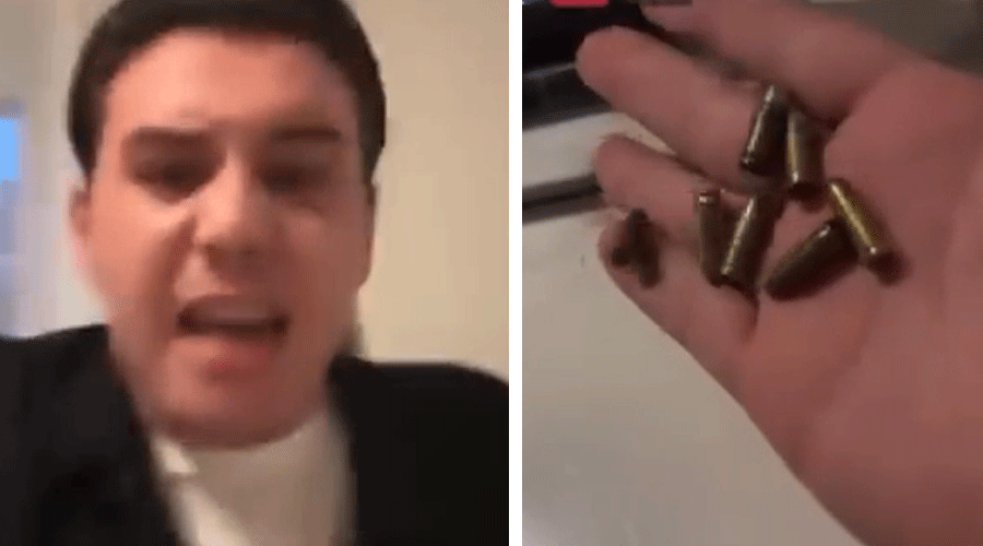 În imagini se vede cum bărbatul ține în mână mai multe gloanțe și îl amenință pe tatăl soției sale că va plăti cu viața pentru ceea ce s-a întâmplat.
