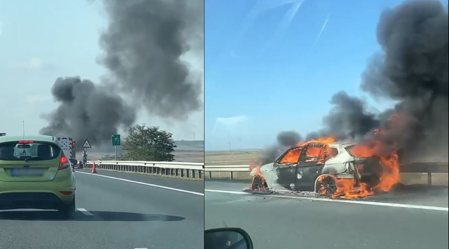 VIDEO: Flăcări uriașe, pe autostradă! O mașină a ars ca o torță