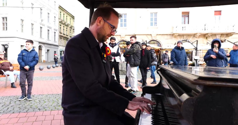 Primarul oraşului, Dominic Fritz le-a făcut o surpriză. S-a aşezat la pianul din piaţă şi a interpretat „Deşteaptă-te române!”