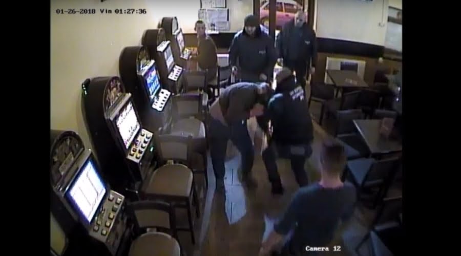 Imagini șocante, filmate de camerele de supraveghere, în care se vede cum clienții unui bar de păcănele sunt snopiți în bătaie de bodyguarzi.