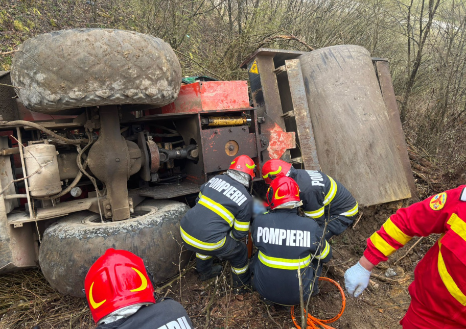 Acesta a fost victima unui accident de muncă. A rămas captiv într-o râpă de aproximativ 7 metri, prins sub un cilindru compactor, după ce utilajul s-a răsturnat și a căzut.