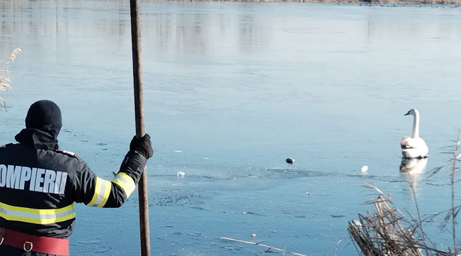 Intervenţie de suflet a pompierilor care au fost chemaţi, în urmă cu puţin timp, să salveze două lebede care au rămas prinse în stratul de gheaţă format pe o baltă din Orăştie.