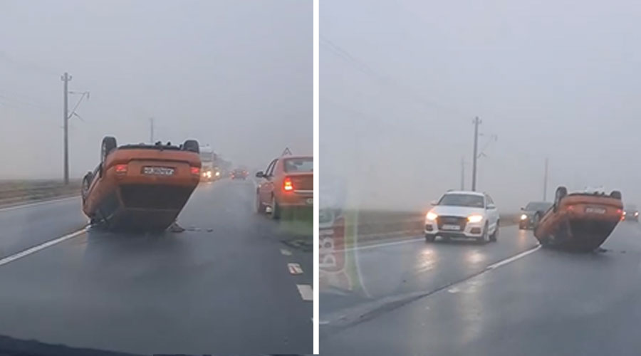 Video: Maşină cu roţile în sus, pe o şosea intens circulată! Cum s-a petrecut accidentul?