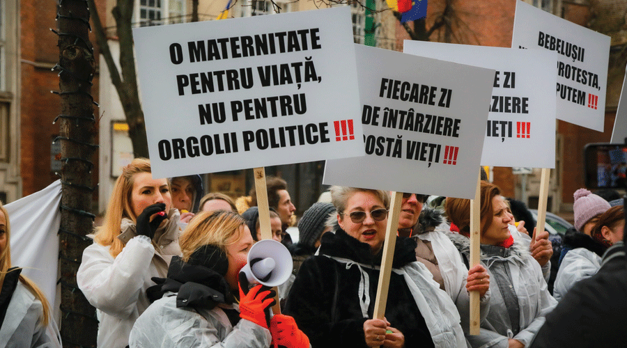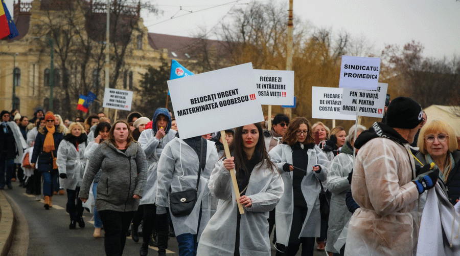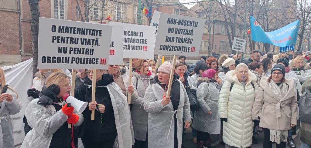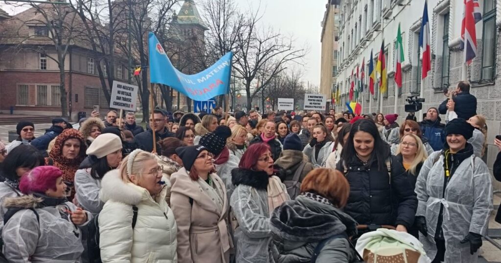 Angajații de la Maternitatea Odobescu din Timișoara au ieșit în stradă! Lor li s-au zeci de mămici dar și simpli timișoreni, care au pornit în marș spre Primărie, unde vor protesta până la ora 16.00.