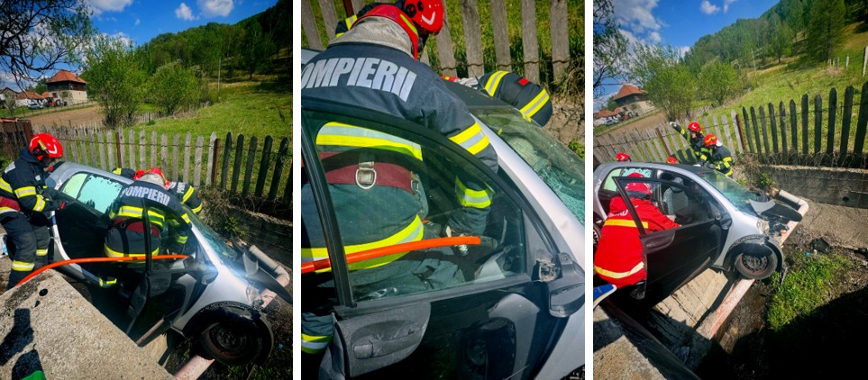 În mașină erau trei persoane, șoferița și încă două pasageri. Toate cele trei victime au rămas înacercerate și a fost nevoie de intervenția pompierilor militari.