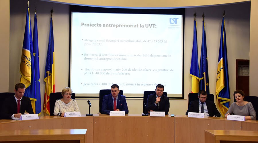 – Program integrat de stimulare a antreprenoriatului în mediul urban din Regiunea Vest: 8.137.354 lei. În cadrul acestui proiect, UVT este partener alături de ROMACTIV BUSINESS CONSULTING SRL.